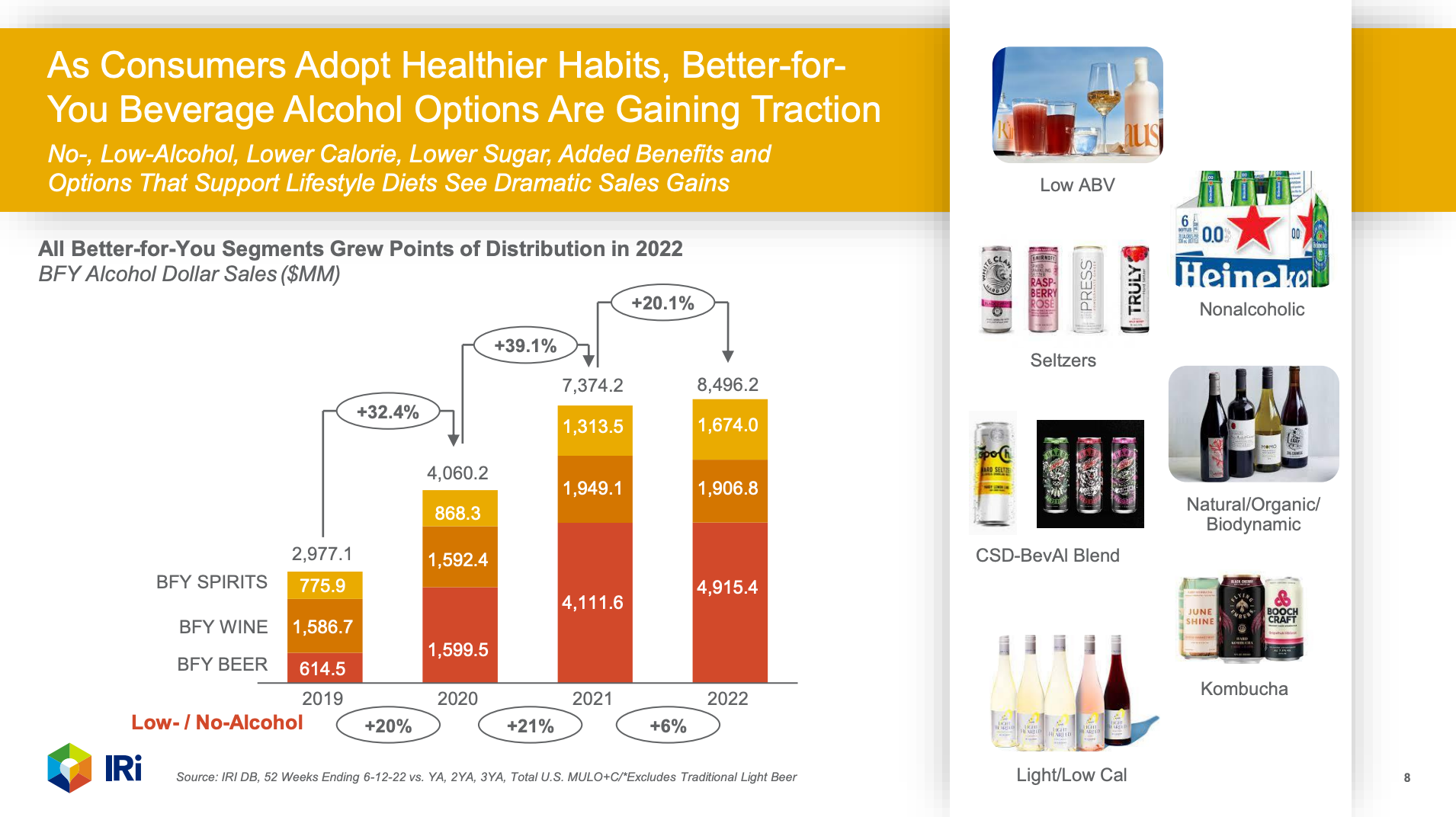 IRI says the "better-for-you" alcohol category saw a 20.1% sales increase (in the USA) from 2021 to 2022, to $8.5 billion, while low and no-alcohol beverages saw a 6% increase.