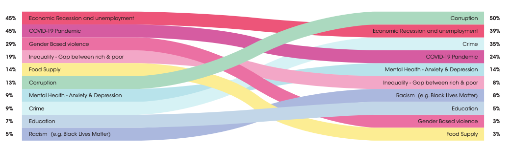 In contrast, whilst the 18-24year-old segment were most concerned about the economic recession and the COVID-19 pandemic, they showed less concern for corruption and crime.