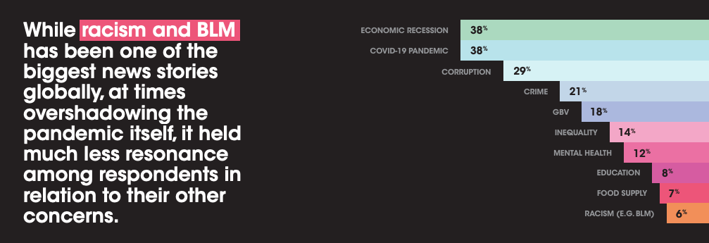 BLM and GBV are big news stories internationally - often times it feels like these issues are trumping the global concern about the virus, but in South Africa these themes are nowhere near as worrying as the collective anxiety we all have about the economic recession.