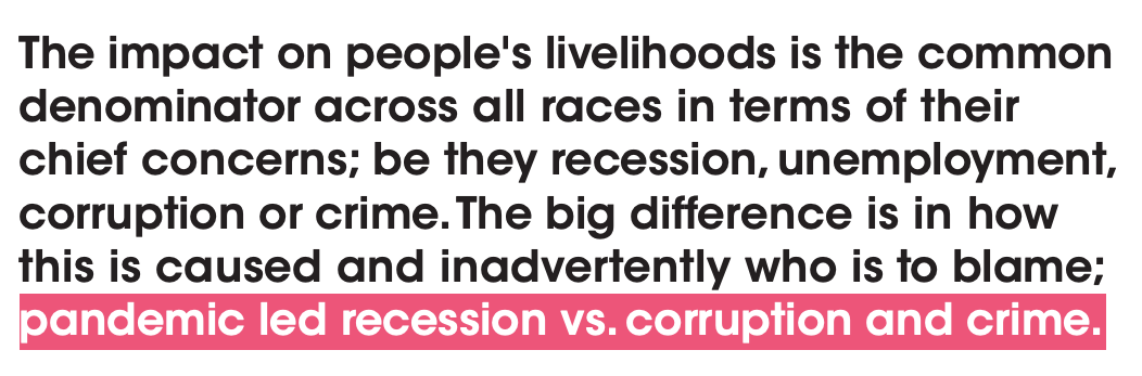 'Whilst other age groups rated the economy and COVID-19 as their 2 main concerns, the 50 years plus segment named Corruption as their chief concern.