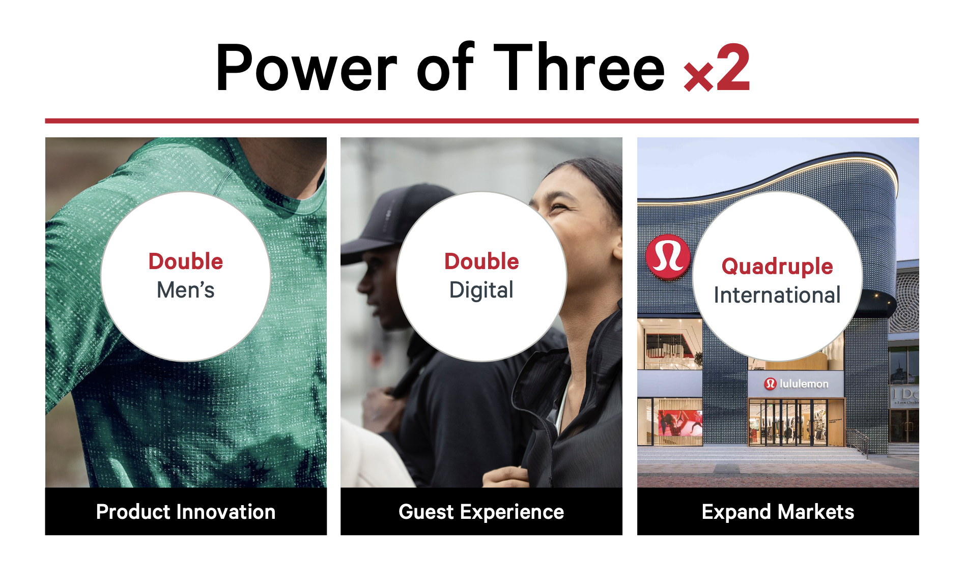 Like all good strategies, the Lululemon strategy has a catchy name; 'Three x 2' - a clever way of saying that the business is collectively focusing on three key strategic leverage points to achieve a doubling of their revenue. Financial targets alone are obviously far too shallow to be useful as a effective strategic 'north star'.