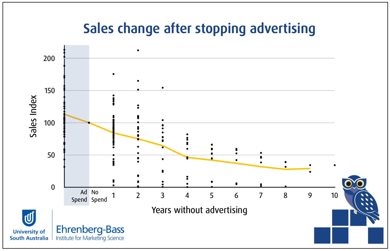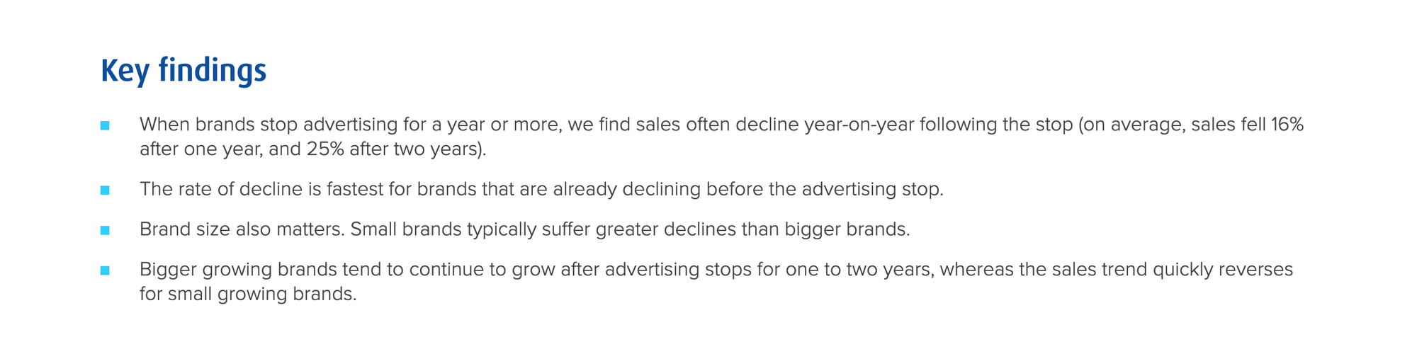 Surprise surprise this is not a situation unique to them. Even brands that are well-established can easily drop off the market place radar and miss out on opportunities if they slack of, or fail to consciously keep on advertising and evolving the brand. It happens in a heartbeat. Yes, research done by the Ehrenberg-Bass Institute in Australia broadly proves that if you stop advertising - you lose sales.
