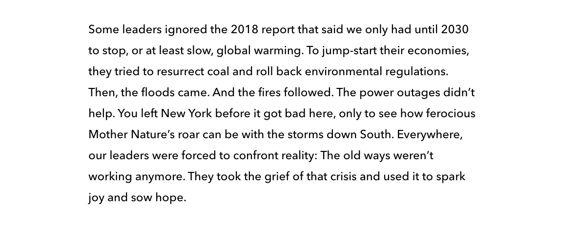 Outdoor mega-brand, Patagonia, have channeled this creative futures thinking exercise in a letter from the future, which the company has shared widely with their audiences.