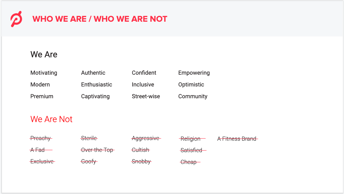 Peloton are very specific as to what they stand for, but are also very clear as to what words do not form part of the Peloton universe. It's interesting that they are so specific about labelling themselves not a fitness brand.
