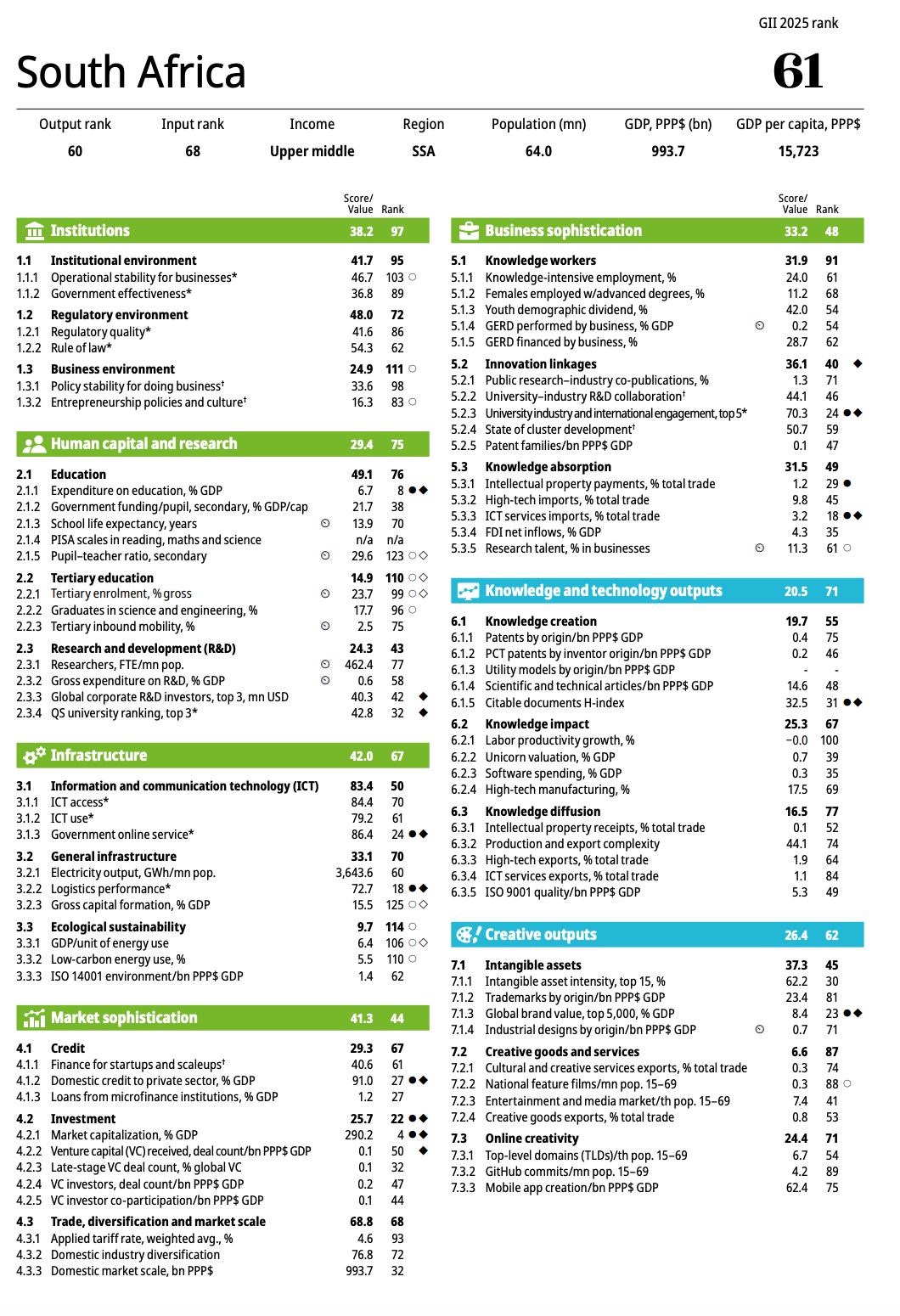 The 2025 edition of the Global Innovation Index ranks South Africa at #61 (inline with our previous ranking) out of 139 countries for innovation, behind regional competitors Mauritius and Morocco.