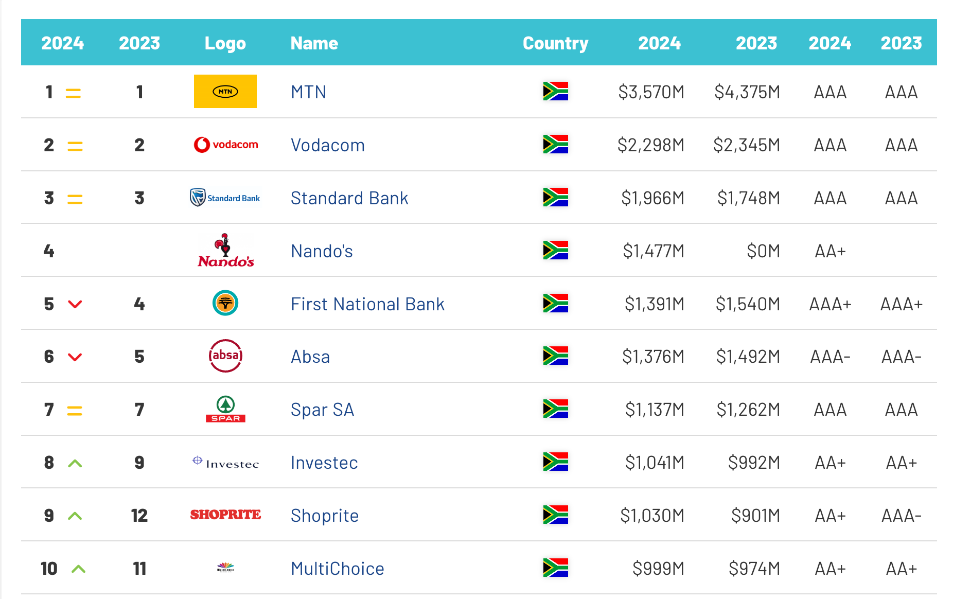 The 2024 version now welcomes Nando's (where they have been all along, nobody knows), Investec (well deserved, great brand) and Multichoice (a big surprise to us too).