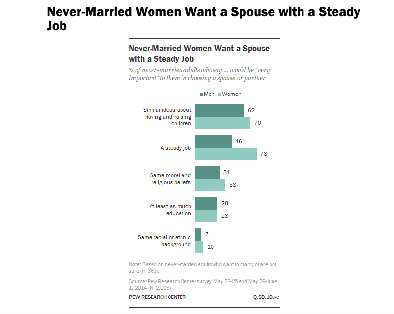 According to the research: 'Women’s potential husbands had an average income that was about 58% higher than the actual unmarried men currently available to unmarried women. They also were 30% more likely to be employed and 19% more likely to have a college degree.