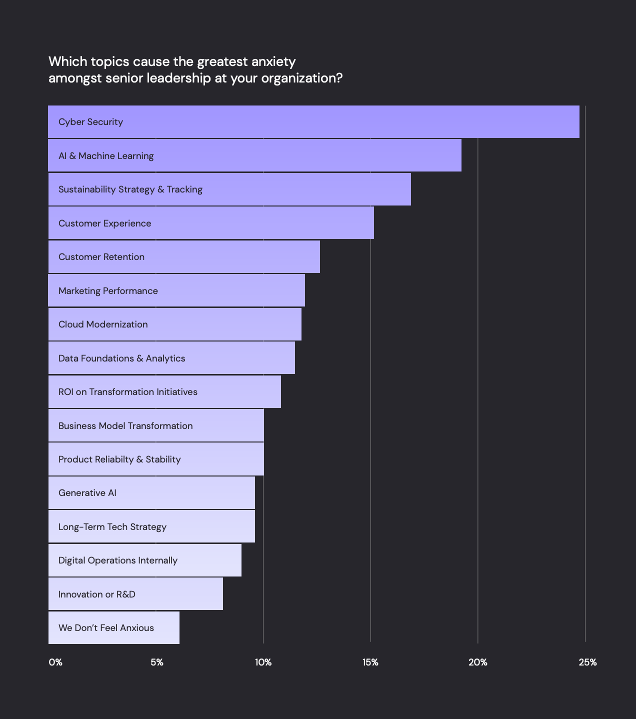 Your digital transformation begins hereIn response, there has been an increase in tech anxiety. Our research reveals 94% of leaders report tech anxiety among senior leadership in their organizations. Our survey found that cyber security is the most common source of anxiety for leaders. While research showing global cyberattacks rose by 7% in Q1 2023 suggests concerns over cyber security are unlikely to abate. Anxiety about artificial intelligence and machine learning is also commonplace. Combining concerns over AI and machine learning and generative AI, the case can be made that this emerging technology is causing more anxiety than anything else.