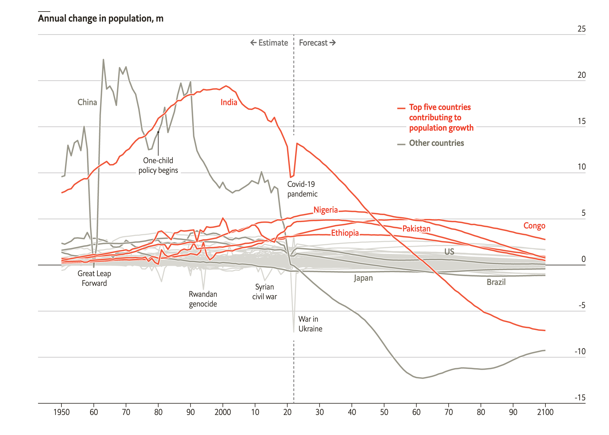 About half the world’s projected population growth between 2022 and 2050 will occur in just eight countries. Five of those are in Africa (Congo, Egypt, Ethiopia, Nigeria and Tanzania). The other three are in Asia (India, Pakistan and the Philippines). India will probably overtake China as the world’s most populous country next year. Africa overtook the combined populations of Europe and North America this year (in 1980 it had just one-third of their total).
