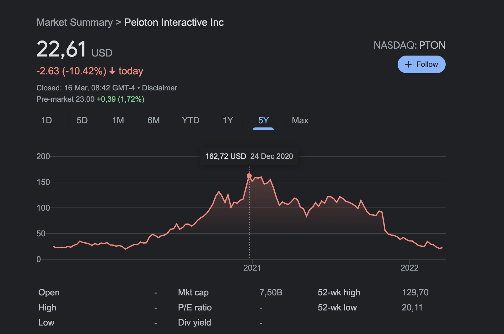 In pure dollar terms, the Peloton stock price has fallen off a cliff; going from a high of $162.72 in December 2020 to just over $20 today.