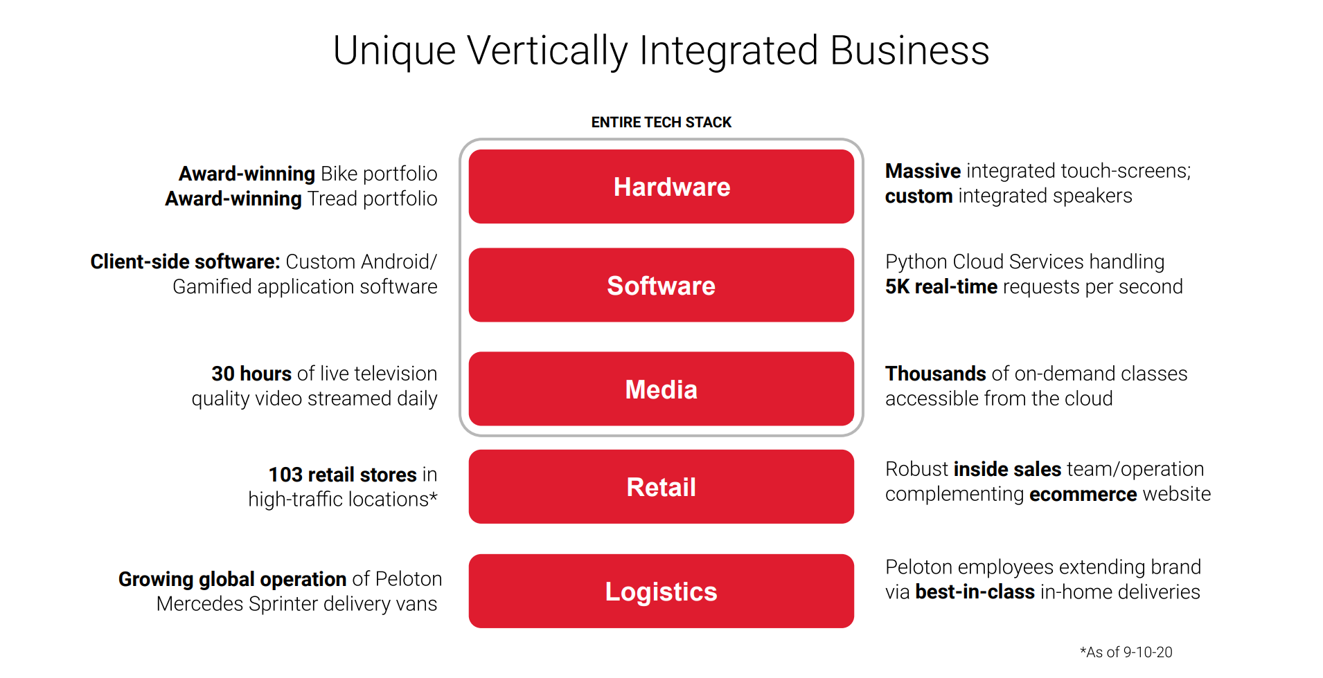 They designed and built pretty much everything themselves: their own stationary bike, the software, the content, they ran the retail outlets that sold the bikes...they even handled their own deliveries.